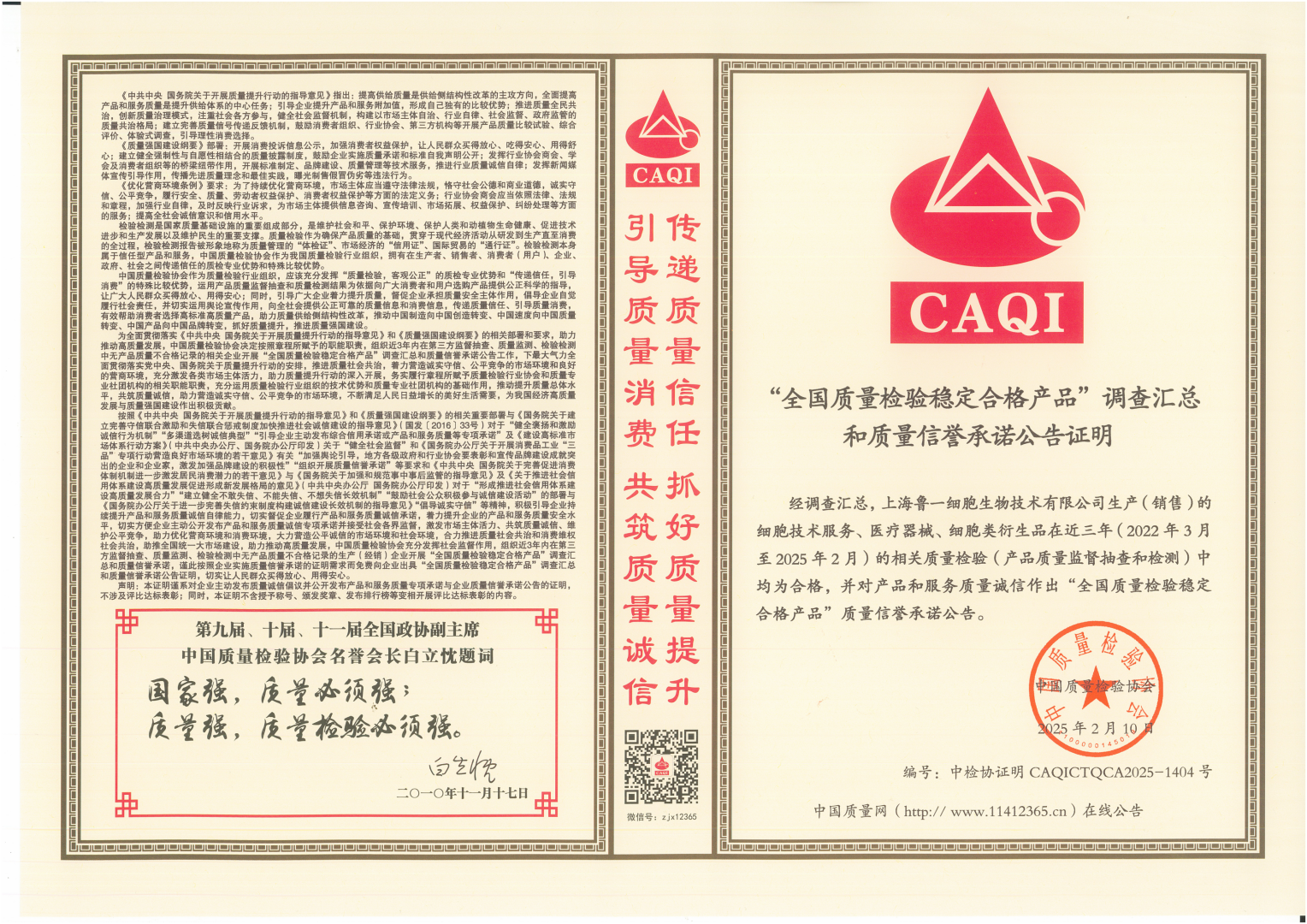 经中国质量检验协会(CAQI)严格开展的多维度核查与综合评定,威客电竞生产(销售)的细胞技术服务、医疗器械、细胞类衍生品在近三年(2022年3月至2025年2月)的相关质量检验(产品质量监督抽查和检测)中均为合格,并对产品和服务质量诚信作出“全国质量检验稳定合格产品”质量信誉承诺公告。